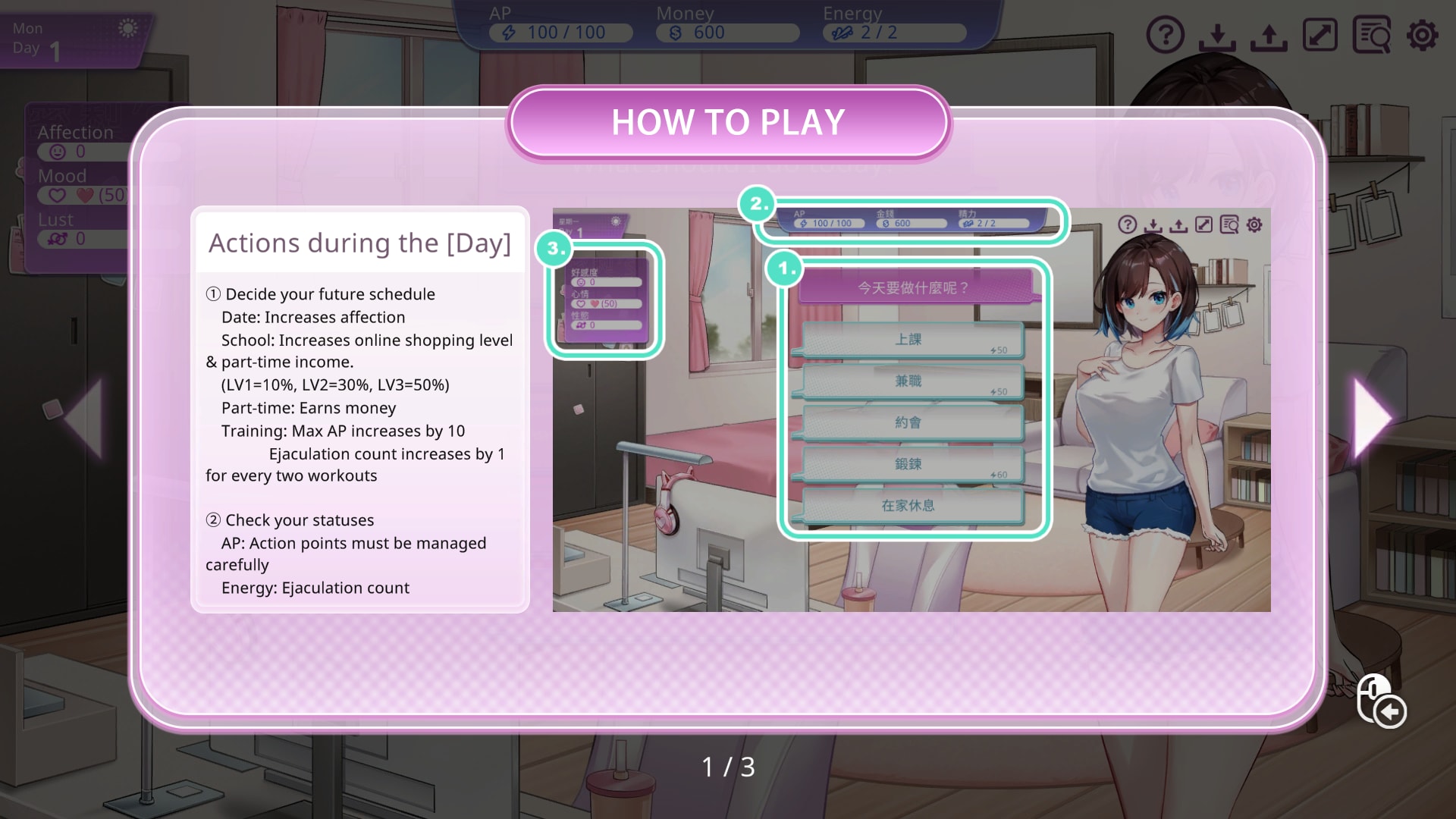 Penerapan sandbox disini sangat sederhana, affection untuk membuat karakter Mili suka terhadap mc bisa dicapai dengan cara mengajaknya bicara, memberikan hadiah, hingga date. Untuk melakukan sesuatu pada game ini pemain harus melihat energi mc, setiap aktivitas bergantung energi dan sesi gameplay dibagi 2 tiap harinya pagi dan malam. MC juga bisa melakukan part-time untuk menghasilkan uang yang dapat digunakan untuk membeli item berguna untuk progress cerita.